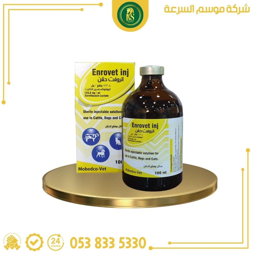 - انروفيت هو مضاد حيوي قوي من مجموعة الفلوروكينولونات، يحتوي على مادة إنروفلوكساسين (Enrofloxacin) المعروفة بفعاليتها ضد مجموعة واسعة من البكتيريا المسببة للأمراض التنفسية والهضمية والبولية والجلدية في الأبقار والقطط والكلاب.