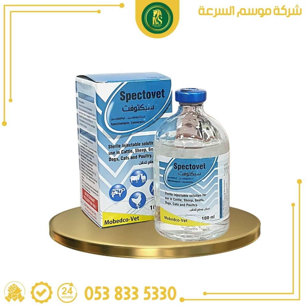 - سبكتوفيت 100 مل تركيبة قوية تجمع بين لينكومايسين وسبكتينوميسين لعلاج طيف واسع من الالتهابات البكتيرية في العجول غير المجترة، الأغنام، الماعز، الدواجن، والكلاب والقطط